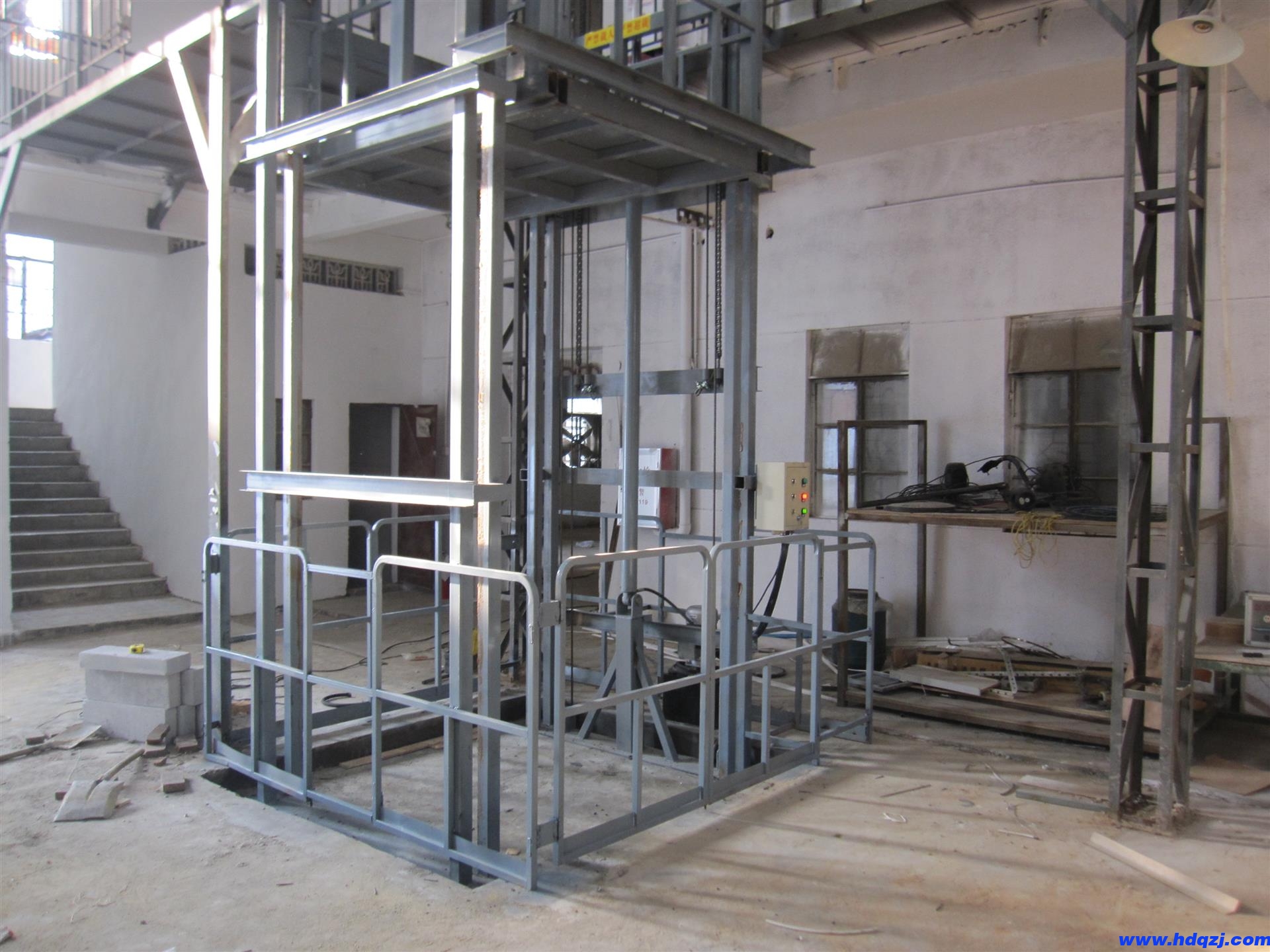 2、導軌式升降機,結構為油缸直頂式,通過油缸的直線運行拉動傳動鏈條,帶動臺面的升降,完成作業,導軌式升降機是近年來比較普及的一種貨梯形式,其優點是升降高度比剪叉式升降機更高,運行穩健,維護簡單等。